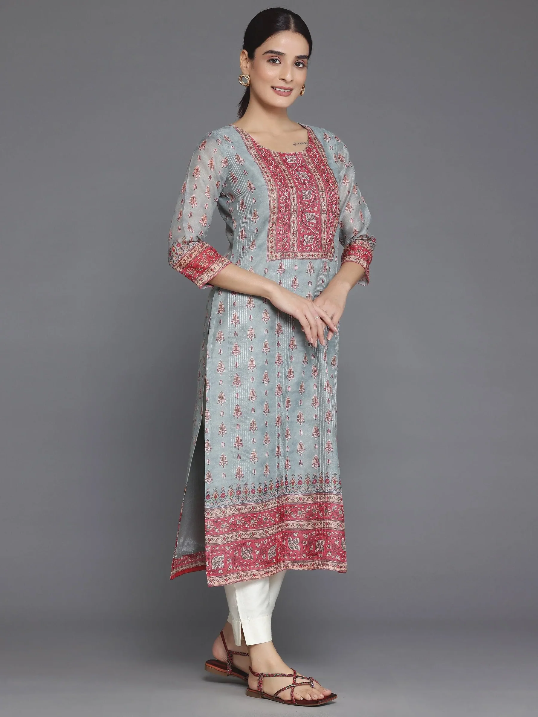 Grey Embroidered Silk Blend Straight Kurta